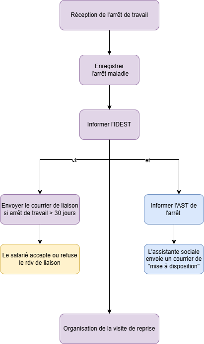 - Informer sur les droits lors de l'arret (ex : organiser une visite de reprise ou de pré-reprise (notamment pour les arrêts longs).